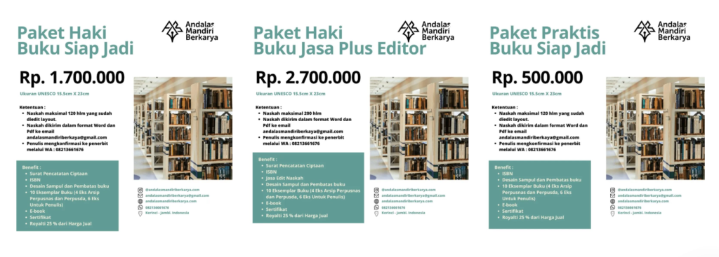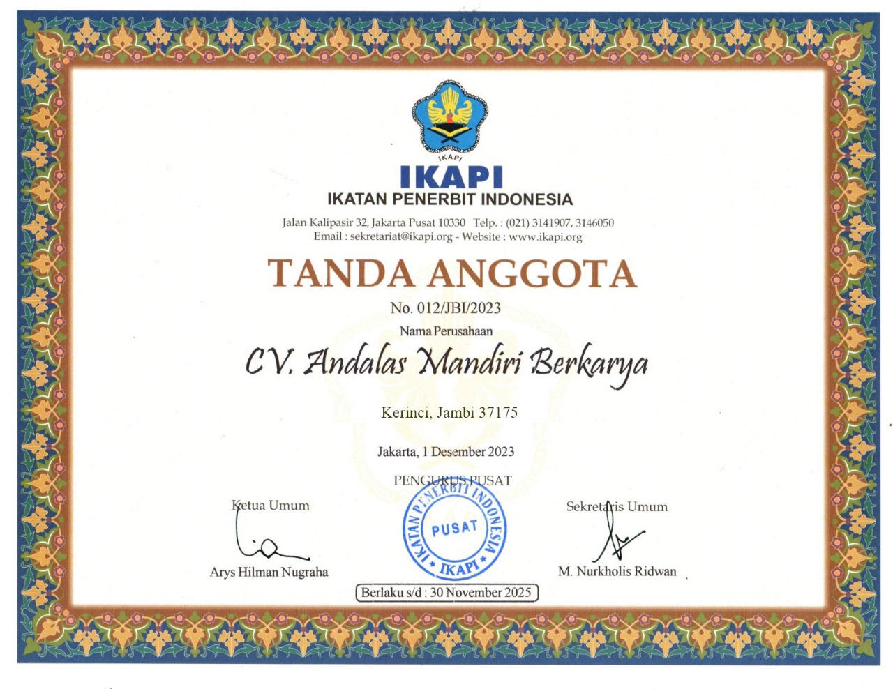 Demi mencapai Visi dan Misi menjadi penerbit buku yang profesional dan andal dalam mengembangkan literasi. Penerbit CV. Andalas Mandiri Berkarya Telah resmi bergabung dengan Ikatan Penerbit Indonesia (IKAPI) Sejak 1 Desember 2023